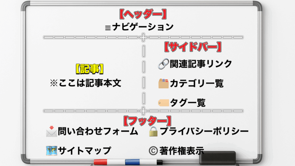 ナビゲーション | 記事への導線(カテゴリ、関連記事、補助リンク) | ヘッダー、サイドバー、フッター | クリック3回以内で目的の記事に到達できる導線 |
